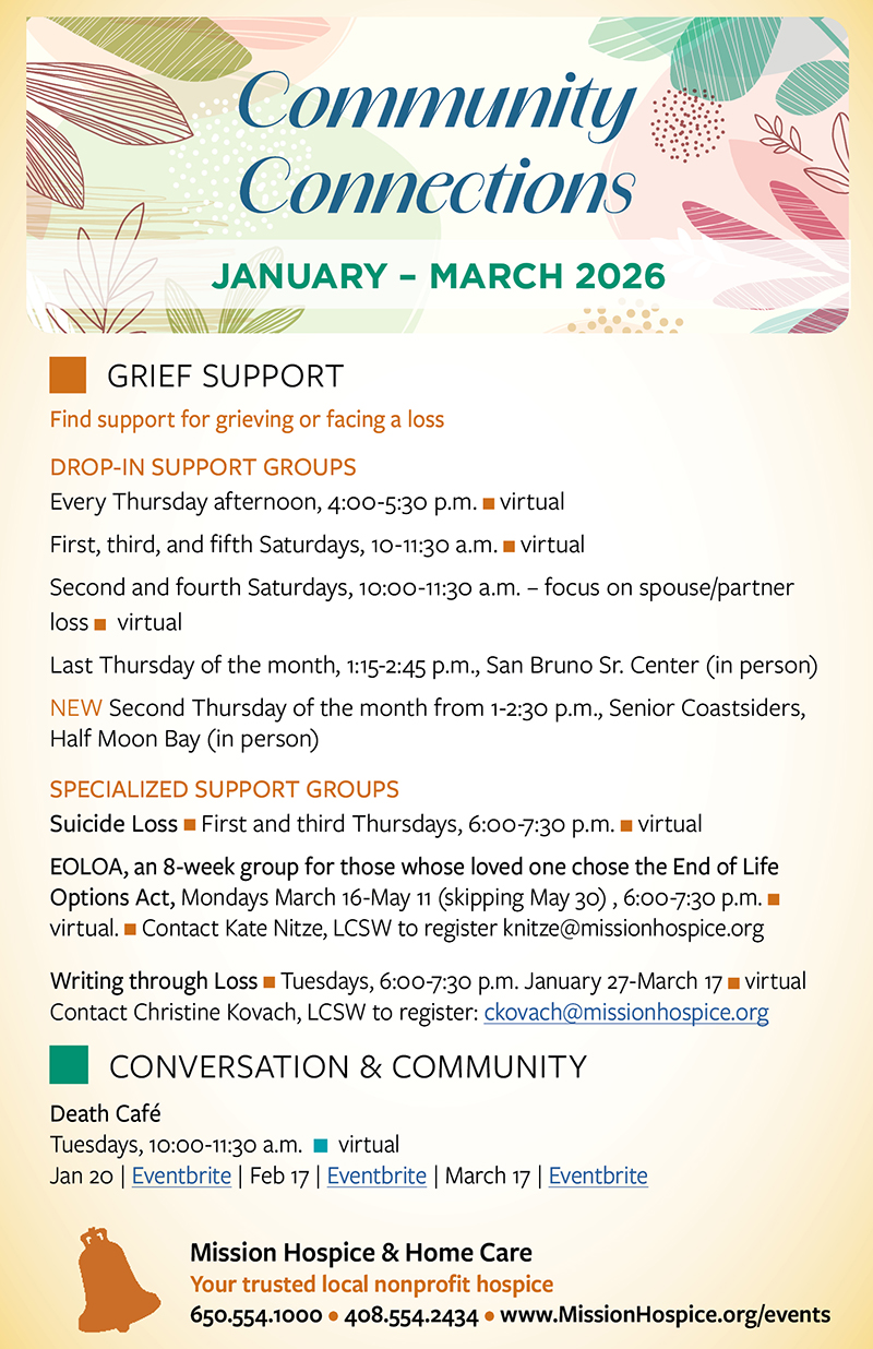 Community connections are part of a life well-lived. These events offer you opportunities to connect with others and explore together what it means to live and die well. Whether you want to learn or discuss, are considering future care for you or a loved one, know someone who is grieving, or are interested in supporting our mission, we invite you to join us. Download your copy of our Community Connections guide today. You can find videos of some of our past events here.